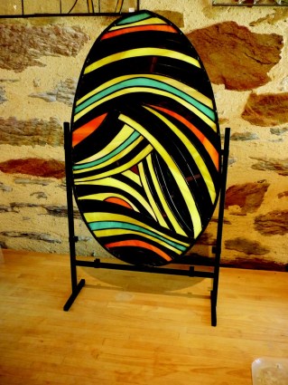 Elle utilise deux techniques, la traditionnelle au plomb et la technique dite « Tiffany », au cuivre. Cette dernière permet de réaliser des modèles plus modernes, plus légers et plus petits. Il s’agit d’une manière différente et moderne de travailler le vitrail et de le sortir du lieu habituel où il est visible : l’église. Juliette Langlet propose des pièces originales, des appliques, des lampes, des bijoux qui semblent être des sculptures.